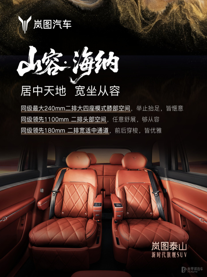 官方表示,岚图泰山拥有1070mm前排头部空间,前排乘坐宽度达1494mm。
