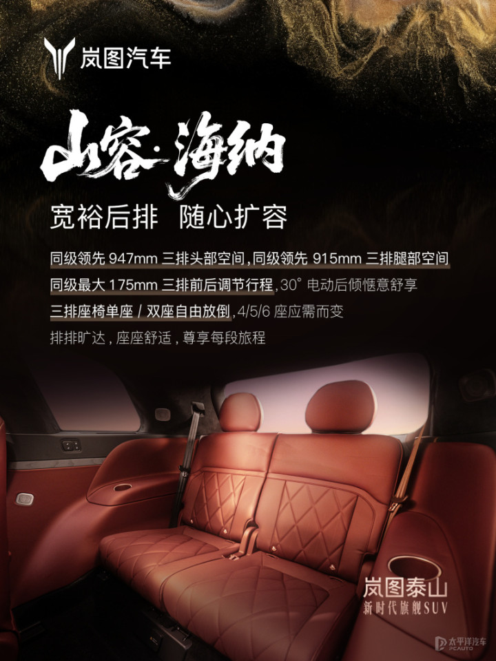 车身尺寸方面,岚图泰山的长宽高尺寸分别为5230/2025/1817mm,轴距为3120mm,采用“2+2+2”六座布局,整体尺寸与竞品车型相当。