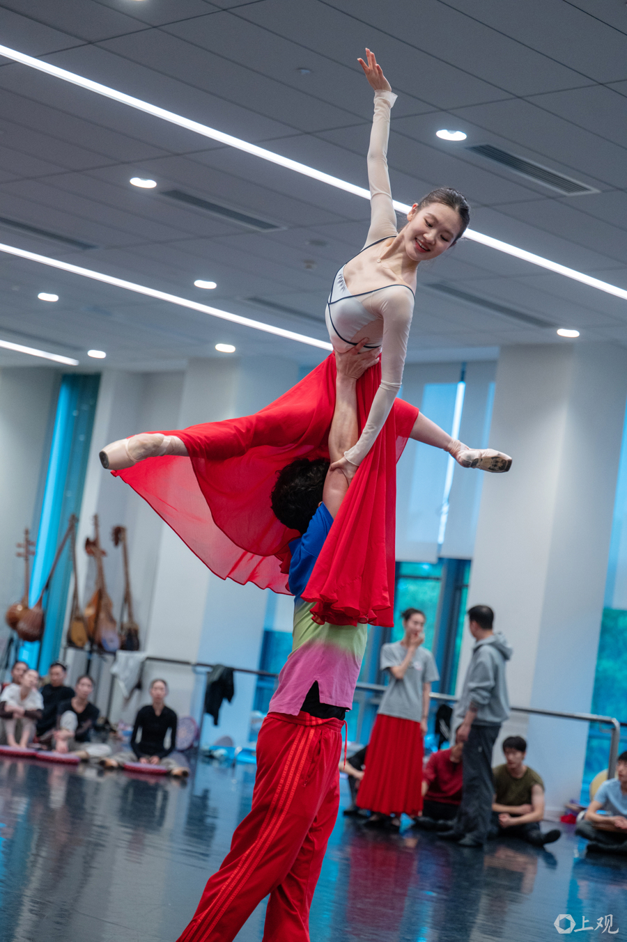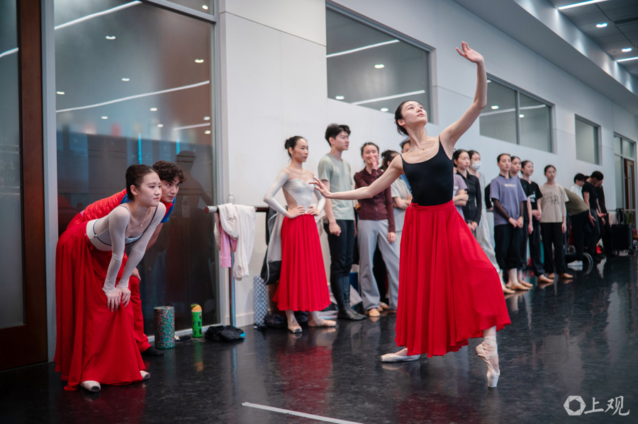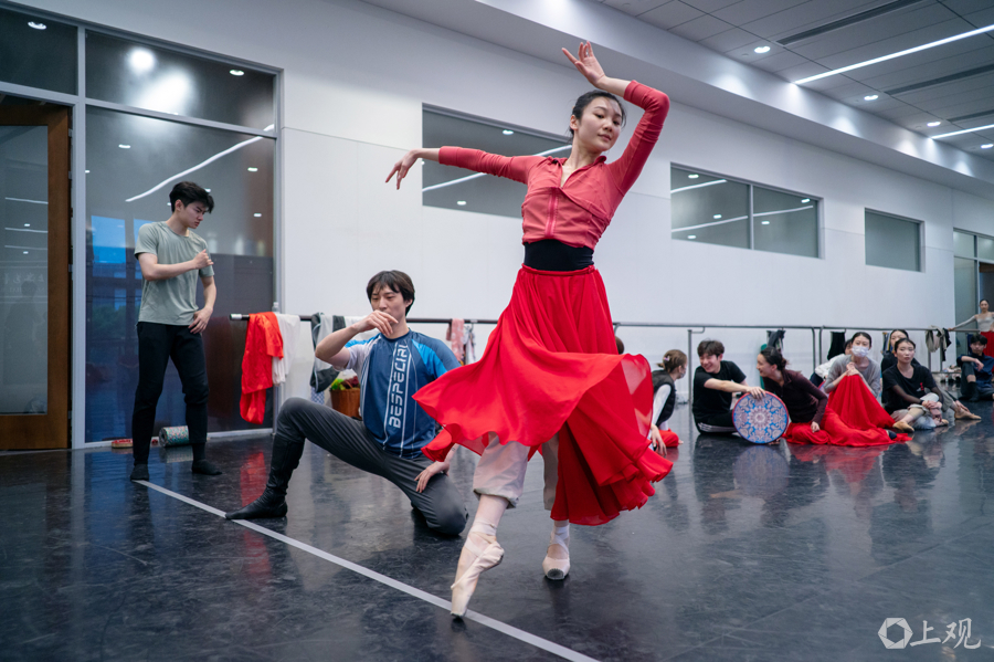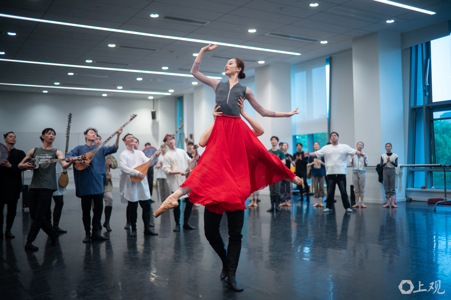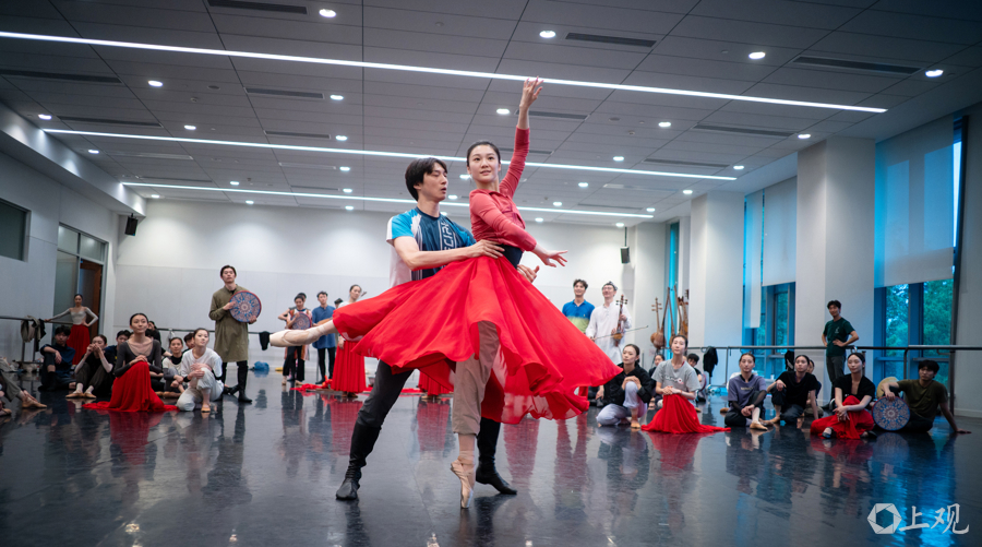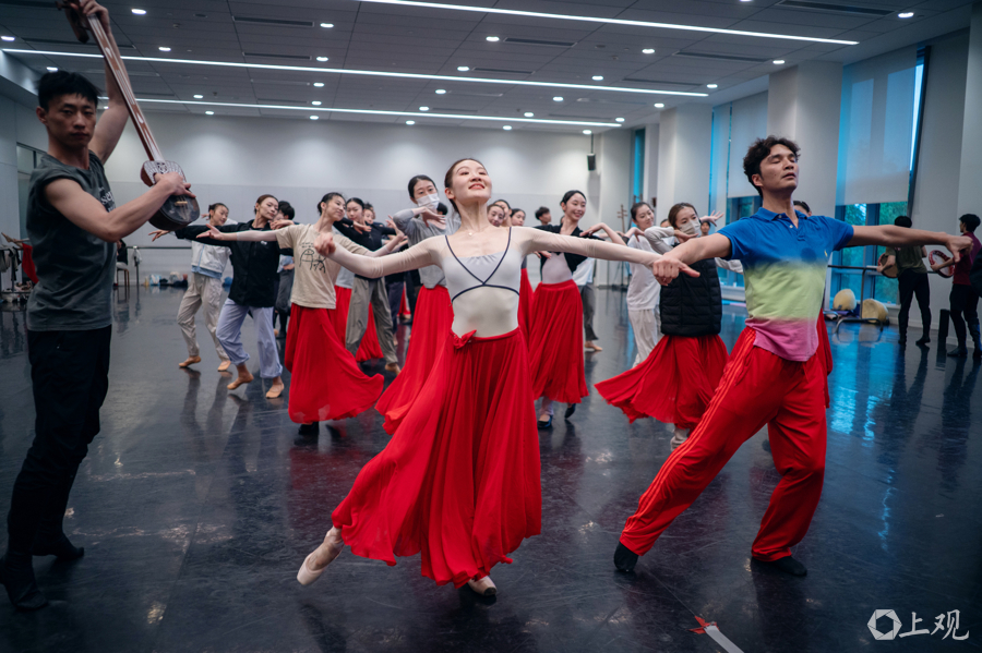 近日,上海芭蕾舞团排练厅内,演员手持舞台道具开展分段联排与走位打磨。原创芭蕾舞剧《寻找木卡姆》已进入首演前最后的合成阶段。